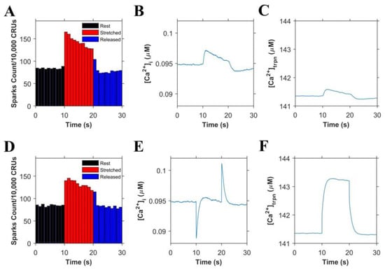 Simulation results (n = 20 simulations) in resting cells. (A–C). Simulations in which troponin’s affinity to Ca2+ does not increase during the stretching of cardiomyocytes: A. Ca2+ sparks histograms for 1 s bins. B. Concentration of Ca2+ in the myoplasm ([Ca2+]i). C. Concentration of Ca2+ bound to troponin ([Ca2+]trpn). (D–F). Simulations in which troponin’s affinity to Ca2+ increases during the stretching of cardiomyocytes: D. Ca2+ sparks histograms for 1 s bins. E. Concentration of Ca2+ in the myoplasm ([Ca2+]i). F. Concentration of Ca2+ bound to troponin ([Ca2+]trpn).