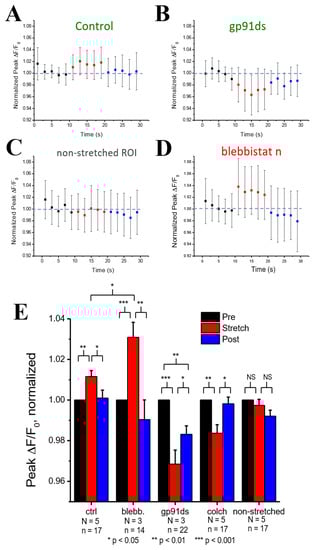 Blebbistatin is a chemical that inhibits actin and myosin crossbridge formation by lowering the affinity of myosin binding to actin. Consistent with this action, the Ca2+ binding affinity of troponin has been reported to decrease with increasing blebbistatin and increase with an increase in sarcomere length []. Monitoring [Ca2+]i in blebbistatin-treated myocytes, we show that stretch elicits a greater increase in [Ca2+]i compared to stretch in untreated controls (Figure 3B,E). To dissect the contribution of X-ROS to the regulation of the global Ca2+ transient, we treated myocytes with gp91ds-TAT (a peptide inhibitor of NOX2), or colchicine (to destabilize the microtubule network, see []. The X-ROS signaling phenomena is the increased activation of RyR leading to increased Ca2+ sparks induced by stretching the myocyte. Stretching the myocytes deforms the microtubular network that activates NOX2 to produce ROS. Previous studies with DCF fluorescence showed that ROS was increased during stretching []. The DCF fluorescence measurements were not repeated here. Colchicine was used to reduce the microtubular network and hence the activation of NOX2. X-ROS suppression with either method significantly decreased peak of the global Ca2+ transient with stretch, essentially unmasking the increase in Troponin C Ca2+ affinity with stretch (Figure 3C,E).