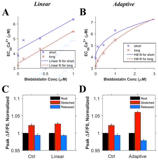 Informed by these new experimental results on the global transient, we conducted numerical experiments. In order to model the effects of blebbistatin, experimental data quantifying the effects of blebbistatin on the Ca2+ affinity of troponin were considered. According to the observation by Farman et al. [], there was a decrease in calcium sensitivity with an increase in the blebbistatin concentration. However, using the approximately linear fit suggested in the paper, the length-dependent differences in the calcium binding affinity of troponin remained relatively constant between 0 and 1 µM blebbistatin, as seen by the difference between the two lines in Figure 4A. On the other hand, fitting the EC50 data for calcium sensitivity to the Hill equation (adaptive fit) gave a better least squares error than a linear fit for both the short and long sarcomere lengths, the result being that length-dependent differences disappear as the blebbistatin concentration increases (Figure 4B). To assess which of these interpretations was more likely, we carried out two sets of simulations considering the data for the linear and adaptive cases. For the first set of simulations, we considered that the length-dependent change in the calcium binding affinity of troponin is the same in the presence or absence of blebbistatin (Figure 4C, linear) and hence, when the myocyte is stretched, the and increases by 20% in both the presence of blebbistatin and the absence of blebbistatin (Figure 5D, ctrl). For the second set of simulations, we considered that blebbistatin (at 3 µM concentration) would inhibit the length-dependent change in the calcium binding affinity of troponin (Figure 4D, adaptive) and hence, when the myocyte is stretched, the and remain unchanged. The results of the second set of simulations (i.e., adaptive) resembled the experimental data (Figure 3E, blebb) more closely than the results of the first set of simulations did (i.e., linear least sq.).