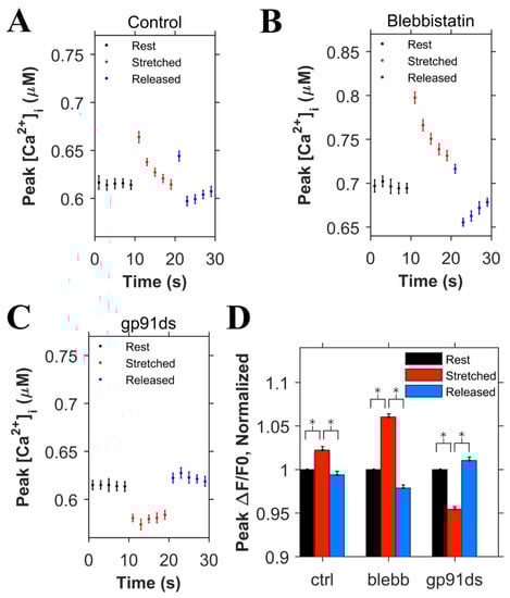 Simulation results (n = 20 simulations) for the peak concentration of Ca2+ in the myoplasm ([Ca2+]i) with 0.5 Hz stimulus when the cardiomyocyte is at rest length (black), stretched (red) and released after the stretch (blue). A. Under control condition. B. When blebbistatin which inhibits the actin myosin bridge is used. C. When gp91ds is used which inhibits NOX2 from producing stretch-dependent ROS. D. The peak ([Ca2+]i) under each subgroup (rest, stretched and released) of each group (control, blebbistatin and gp91ds) is averaged, its corresponding ΔF/F0 is calculated and normalized. * p < 10−14.