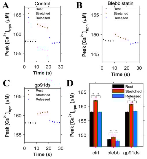 Simulation results (n = 20 simulations) for cardiomyocytes paced at 0.5 Hz (same simulations as Figure 5). The peak value of Ca2+ bound to troponin ([Ca2+]trpn) is shown when the cardiomyocyte is at rest (black), stretched (red) and released after the stretch (blue). A. Under control condition. B. When blebbistatin is used which inhibits the actin myosin bridge. C. When gp91ds is used which inhibits NOX2 from producing stretch-dependent ROS. D. The calculated corresponding average of peak ([Ca2+]trpn) under each subgroup (rest, stretched and released) in each group (control, blebbistatin and gp91ds). * p < 10−22.