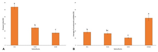 (A) Stem base Disease Index (DI) of soft wheat inoculated with subcultures SC1, SC23, and SC50 of F. graminearum strain FG8. Columns represent the average of three replicates (± SE) with each composed of 10 plants. Values with different letters are significantly different based on Duncan’s multiple comparison tests (p < 0.05). (B) Average percentage of symptomatic spikelets (%) of heads point-inoculated with the FG8 different subcultures. Columns represent the average of three replicates (±SE), in which each is composed of five heads. Values with different letters are significantly different based on Duncan’s multiple comparison tests (p < 0.05).