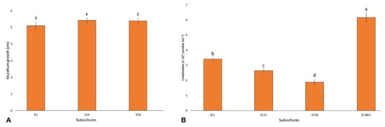Mycelium growth rates from subcultures SC1, SC23, and SC50 were measured on PDA plates. Despite the three subcultures having different adaptation times on PDA (1, 23, or 50 weeks), no significant differences in growth rate were observed (p = 0.42) after 5 days (Figure 3A). In detail, SC1 showed an average growth of 5.1 cm along the axes, whereas SC23 and SC50 showed an average growth of 5.4 cm.