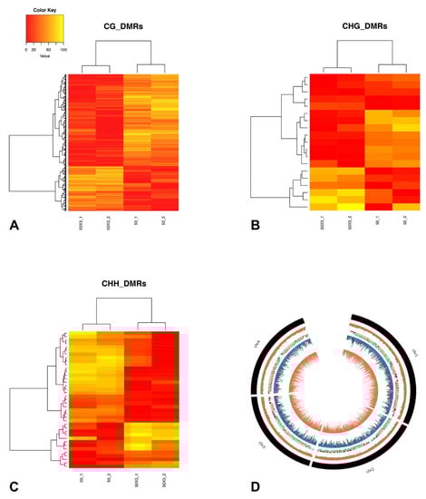 - Cokus, S.J.; Feng, S.H.; Zhang, X.Y.; Chen, Z.G.; Merriman, B.; Haudenschild, C.D.; Pradhan, S.; Nelson, S.F.; Pellegrini, M.; Jacobsen, S.E. Shotgun bisulphite sequencing of the Arabidopsis genome reveals DNA methylation patterning. Nature 2008, 452, 215–219. [Google Scholar] [CrossRef]