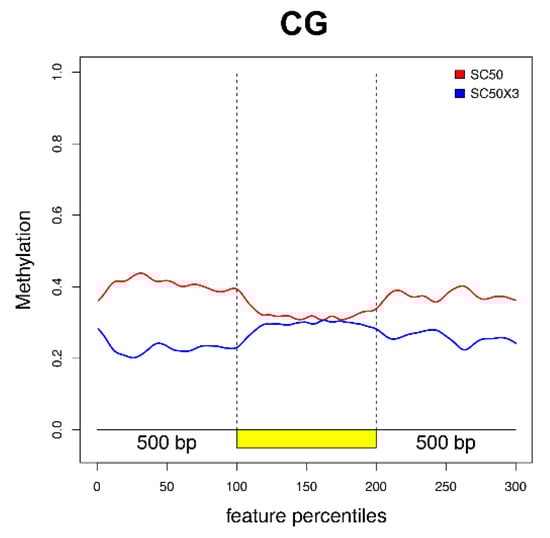 The estimated relative methylation level of the DMPs belonging to each DMR were hierarchically clustered and, as expected, clustered according to the treatment, as SC50×3 or SC50 (Figure 4 and Supplementary Figure S3). In particular, for all three contexts, the number of DMRs with higher methylation levels in the SC50×3 samples (relative to the SC50 samples) was lower than the number of DMRs that showed a lower level in the SC50×3 samples (Figure 4 and Supplementary Figure S3).
