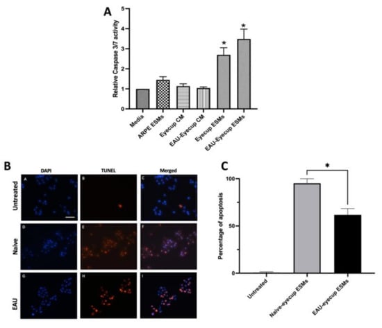 It was previously reported that there is a soluble factor made by RPEs that induces apoptosis in macrophages [,]. To see if the ESMs from RPEs can induce apoptosis in macrophages, we treated the RAW264.7 macrophage cell model with RPE-derived ESMs and assayed for caspase 3/7 activity and DNA breaks by TUNEL staining. The ESMs were isolated from the conditioned media of RPE eyecups from naive and EAU mice. In addition, ESMs were isolated from confluent cultures of ARPE-19 cells []. The ESMs from the conditioned media of RPE eyecups from both naive and EAU eyes significantly activated caspase 3/7 activity (Figure 1A). In contrast, the ESMs from confluent ARPE-19 cells did not induce caspase 3/7 activity, nor did treating the macrophages with whole conditioned media (CM) from naive and EAU RPE-eyecup cultures. The cells were assayed for DNA fragmentation by TUNEL staining (Figure 1B,C). The ESMs from both naive and EAU RPE-eyecup cultures induced completion of apoptosis in RAW264.7 macrophages. The percentage of cells TUNEL-stained was significantly greater with the ESMs from naive RPE-eyecup cultures. These results showed that ESMs from the conditioned media of RPE eyecups induced apoptosis. While there was no difference in caspase 3/7 activation, the ESMs from naive RPE eyecups mediated a higher level of completed apoptosis in the macrophages than the ESMs from EAU RPE eyecups. In contrast, the ESMs from ARPE-19 cells did not induce apoptosis, which showed another significant difference from primary RPE cells.