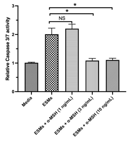 The conditioned media of naive RPE-eyecup cultures induced apoptosis in the macrophages only when the immunomodulatory neuropeptide α-MSH was removed from the conditioned media [,]. In addition, α-MSH provides survival signals to various cells of the retina and macrophages [,,,]. Therefore, the RAW264.7 macrophage cells were treated with α-MSH and then with the apoptosis-inducing ESMs from naive mouse RPE-eyecup cultures. It is reported that after 24 h of incubation there was 1–5 ng/mL of α-MSH in the RPE-eyecup conditioned media []. In a dose-dependent manner, α-MSH significantly suppressed the activation of caspase 3/7 induced by the ESMs from naive RPE-eyecup cultures to background levels (Figure 2). This suggests that the α-MSH produced by the RPE provides a survival signal to macrophages in the presence of apoptosis-inducing ESMs.