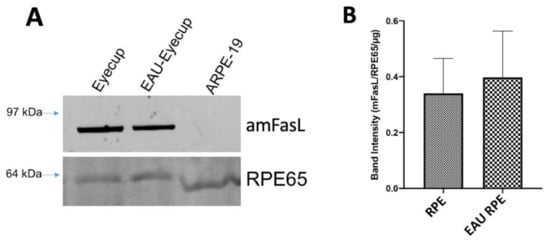 One mechanism by which the ESMs could induce apoptosis in the macrophages could be through the expression of membrane FasL (mFasL), like what was seen in the immune-privileged maternal–fetal interface []. The ESMs were isolated from the conditioned media of the RPE eyecups and from cultures of confluent ARPE-19 cells. The ESMs’ protein cargo was assayed by immunoblotting for FasL. The ESMs from naive and EAU RPE-eyecup cultures had a highly detectible band that corresponds to aggregated mFasL (amFasL; Figure 3A and Supplementary Materials), the hexameric and functional form of mFasL []. The same amFasL is seen in ESMs from placental syncytiotrophoblasts []. Corresponding with the lack of caspase 3/7 activity by ESMs from confluent ARPE-19 cell cultures, there was no detectible FasL in the ARPE-19 ESMs (Figure 3A). When the immunoblots were imaged at 488 nm, a clear band for the autofluorescing RPE65 protein was seen from all the ESMs (Figure 3A). Since RPE65 is a constitutively produced, membrane-bound protein made only within and by RPEs, it provided a relative reference control that showed no difference in the expression of amFasL in the ESMs of naive and EAU RPE-eyecup conditioned media (Figure 3B). These results correspond with detecting caspase 3/7 activity and TUNEL staining induced by the ESMs from naive and EAU RPE-eyecup conditioned media.