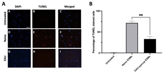 RPE ESMs induction of apoptosis in primary macrophages. The peritoneal macrophages from naive mice were treated with the ESMs from the conditioned media of naive RPE eyecups (Naive) or EAU RPE eyecups (EAU) or were untreated (Media). (A) The cultures were incubated for 24 h and stained by TUNEL assay. No TUNEL-positive cells were observed in the untreated cultures (micrographs A–C); TUNEL-positive cells were seen in the cultures of macrophages treated with ESMs from naive and EAU RPEs (micrographs D–I). Scale bar = 50µm. (B) The cells from the TUNEL assay were counted, and the percentage of TUNEL-positive cells is presented as the mean ± SEM. The macrophages treated with naive ESMs had a significantly (** p ≤ 0.01) higher percentage of TUNEL-positive cells (72 ± 4%) than macrophages treated with EAU ESMs (33 ± 6%). The ESMs isolated from RPE eyecups induce apoptosis in macrophages.