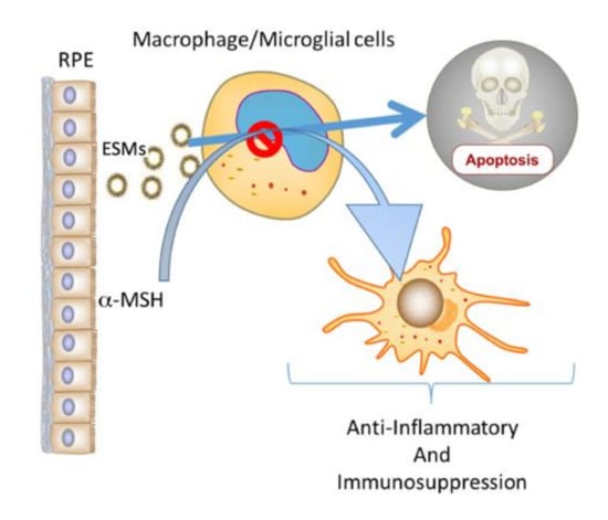 The potential role of ESMs and α-MSH produced by RPEs in ocular immune privilege. Within the immune-privileged eye, RPEs constitutively produce α-MSH and release ESMs. The results demonstrated that ESMs induce apoptosis in macrophages and that α-MSH suppresses the apoptotic signal. Previous publications have shown that α-MSH induces anti-inflammatory and suppressor activity in macrophages. Therefore, this combination of RPE ESMs and α-MSH could act as a selective mechanism that permits the survival of only macrophages and resident microglial cells that act to maintain the anti-inflammatory microenvironment of the eye.