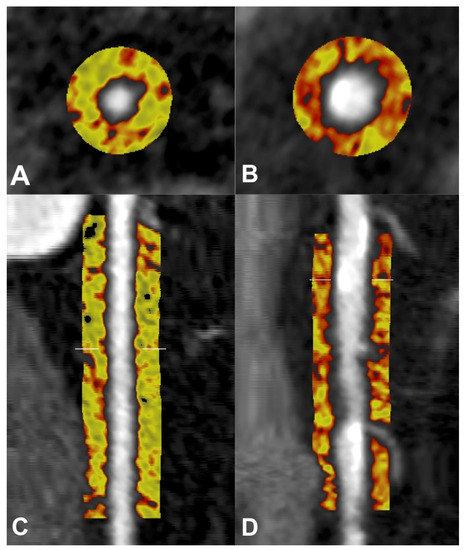 - Marwan, M.; Hell, M.; Schuhback, A.; Gauss, S.; Bittner, D.; Pflederer, T.; Achenbach, S. CT Attenuation of Pericoronary Adipose Tissue in Normal Versus Atherosclerotic Coronary Segments as Defined by Intravascular Ultrasound. J. Comput. Assist. Tomogr. 2017, 41, 762–767. [Google Scholar] [CrossRef] [PubMed]