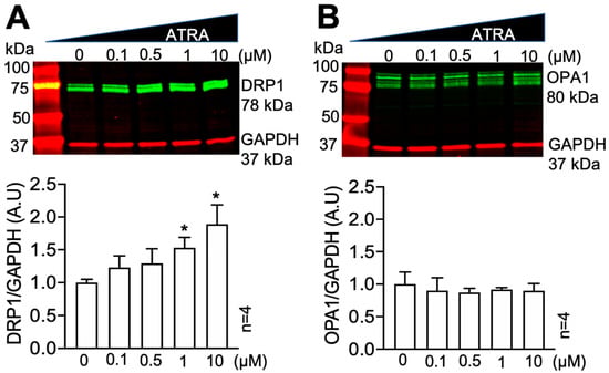 Dose-dependent effect of ATRA on DRP1 and OPA1. Western blot of DRP1 protein levels in HEK293 cells incubated with 0.1, 0.5, 1, and 10 μM ATRA for 24 h, normalized to the levels of DMSO controls (0 μM). (A) ATRA increased the levels of DRP1 in a dose-dependent manner (* p < 0.05, 1, and 10 μM ATRA vs. DMSO control (0 μM); One sample t- and Wilcoxon-test). (B) ATRA did not affect OPA1 levels.