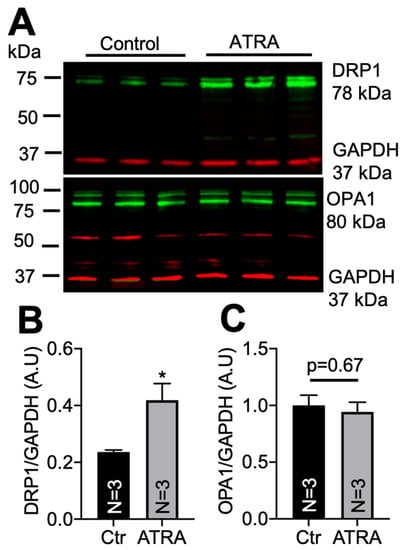 To our knowledge, there is no known pathway directly linking ATRA to increased DRP1 levels. It could be possible that ATRA induces epigenetic modifications through retinoic acid receptor-dependent mechanisms that ultimately modulate DRP1 expression [98].