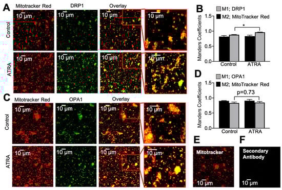 Quantification of mitochondrial localization of DRP1 and OPA1 by confocal microscopy. (A) Mitochondria were labeled with antibodies against DRP1 and (C) OPA1 in purified cardiac mitochondrial clusters from vehicle- (upper panels) and ATRA- (lower panels) treated mice. Red channel: MitoTracker™ Red. (B) and (D) Mander’s coefficient of colocalization between MitoTracker™ Red (M2; black bars) and DRP1 (M1; gray bars) vs. OPA1 (M1; gray bars), respectively. In ATRA treatment, there was a significant increase in DRP1 colocalization with MitoTracker™ Red (* p < 0.01, vs. vehicle; unpaired 2-sample t-test; n = 3 mice; n = 12 images) (B) but no change in OPA1 (n = 3 mice; n = 12 images) (D). Mitochondria were loaded with MitoTracker™ Red (E) and labeled with secondary antibody alone (F).