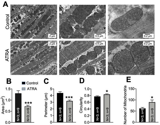We quantified mitochondrial morphology by TEM in the ATRA-treated mouse hearts versus controls. Figure 4A shows micrographs from control and ATRA-treated ventricular tissue sections at 10,000×, 25,000×, and 50,000× magnification. We quantified mitochondrial area, perimeter, circularity, and number in hearts from three ATRA- and three vehicle-treated mice. ATRA significantly decreased the average mitochondrial area (Panel B; *** p < 0.001 vs. control) and perimeter (Panel C; *** p < 0.001 vs. control), and it significantly increased circularity (Panel D; * p < 0.05 vs. control). The number of mitochondria tended to be increased by ATRA but did not reach significance (Panel E; * p < 0.05 vs. control).