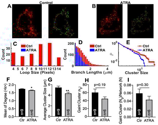 We analyzed Z-stack images from nine control cells and six ATRA-treated HL-1 cells. After preprocessing each experimental image, we generated a graph of the experimental mitochondrial image (Figure 5A,B) and retrieved microscopic network parameters such as <k>, Ng, Ng/N, loop sizes, branch lengths, and cluster sizes for each case (Figure 5C–I). We found that loop sizes, branch lengths, and cluster sizes were all shifted to smaller values in the ATRA-treated cells (blue) than in the control cells (red), suggesting a relative increase in fission in ATRA-treated cells (Figure 5C–E). Similarly, microscopic network parameters including mean degree, average cluster size, largest cluster size (Ng), and largest cluster size normalized with respect to the total network size (Ng/N) were reduced in ATRA-treated cells (gray bars) compared to control cells (black bars) (Figure 5G–I). However, the mean degree (<k>) and average cluster size were significantly decreased in ATRA-treated HL-1 cells compared to the control. The largest clusters size (Ng) (Figure 5H; p = 0.19 vs. control) and the largest cluster size normalized with the total network (Ng/N) tended to decrease but did not reach statistical significance.