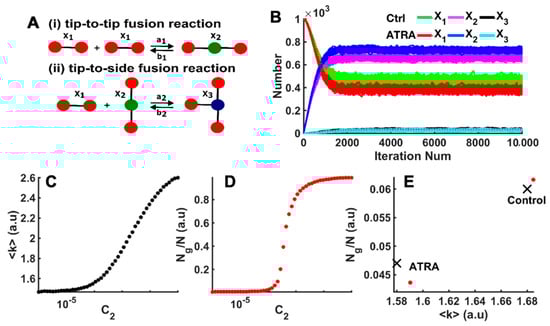Estimating relative fusion and fission rates using agent-based model. (A) Model scheme representing the tip-to-tip fusion of two X1 nodes into X2. Tip-to-side fusion of one X1 node with one X2 node to form one X3 node, as well as the corresponding fission processes. (B) The number of vehicle (control), or ATRA X1, X2, and X3 species from the model as functions of the number of iterations using the C1 and C2 values given in Table 1. Model results for mean degree (C) and Ng/N (D) as functions of C2 at fixed C1 = 0.0007 and n = 3000. (E) Comparison of Ng/N versus <k> values obtained from experiment (red bullets) and simulation (black crosses) in control and ATRA-treated cells.