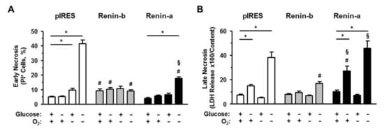 Under basal conditions, the number of propidium iodide (PI)-positive, early necrotic cells, was higher in renin-b cells (p < 0.05) compared to pIRES control and renin-a cells. The amount of late necrosis as detected by the LDH ratio was low and similar between the cell lines. Exposure to glucose starvation affected only the degree of late necrosis. The LDH ratio increased significantly in pIRES control (p < 0.01) and even more pronounced in renin-a cells (p < 0.001), while renin-b cells remained unaffected. Anoxia alone was well tolerated by the cell lines. Only in pIRES control cells, the percentage of early, PI-positive necrotic cells increased significantly (p < 0.01). OGD induced a marked increase of both early and late necrotic cell deaths in pIRES control (p < 0.001) and renin-a cells (p < 0.001). Late necrosis was also increased in renin-b cells (p < 0.01), but to a much lesser extent than in the other cell lines.