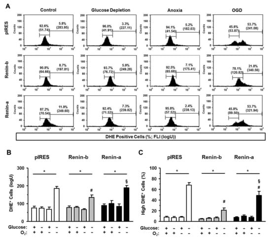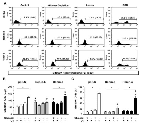 p < 0.001), respectively, indicating an accumulation of mitochondrial superoxides in these cell lines. Renin-b cells were protected from the OGD-induced increase in MitoSOX FLI. Furthermore, the increase in the percentage of MitoSOX-positive renin-b cells was mitigated (
