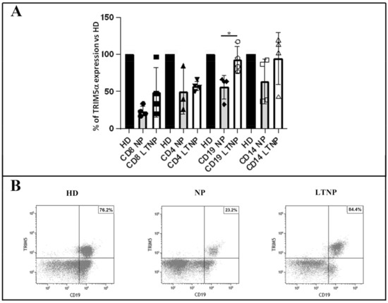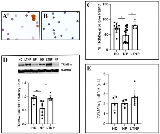 We analyzed freshly isolated PBMC from HIV-1-infected patients and healthy donors (HD) by immunocytochemistry (Figure 1A,B). PBMC were immunolabeled, utilizing an antibody against TRIM5α, and afterwards, the TRIM5α-positive cells were quantified. A significant increase in the percentage of TRIM5α positive cells was detected in LTNP compared to NP (p < 0.05) (Figure 1C). Interestingly, PBMC from NP showed a significantly lower percentage of positivity also compared to HD (p < 0.05). In the HIV-1 controllers, more than 80% of PBMC express TRIM5α, while in the NP, fewer than 50% of cells were positive. We also analyzed the relationship existing between TRIM5α-positive cells and the viremia of patients, showing that there was no linear correlation between these parameters (Figure S1).