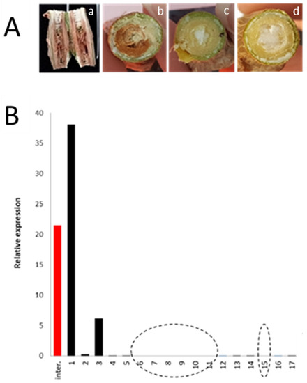 At the graft intersection area, severe necrosis of the TMS 96/0304 tissues was noticed (Figure 1A) and a high virus load was found (Figure 1B, red bar and sample 1). In distant regions from the graft intersection, the virus titer instantly decreased to almost undetectable values around the threshold of the qRT-PCR and was nil in many sections from DSC 167 branch (Figure 1B, open circles). The erratic detection of the virus in stem slices suggested that the virus was translocating through the stem but not accumulating in cells and tissues.