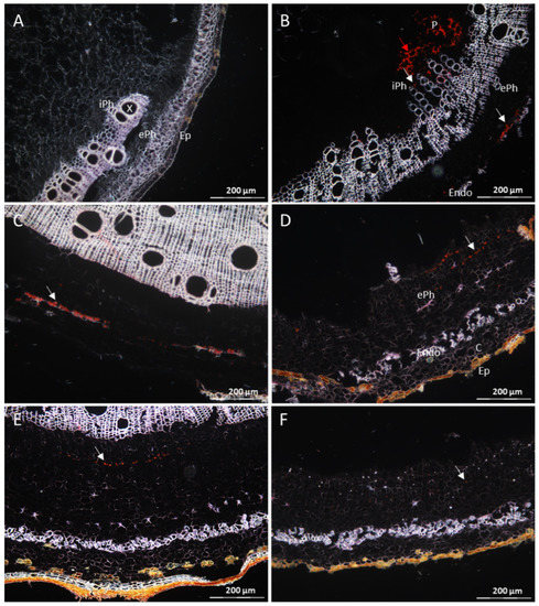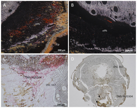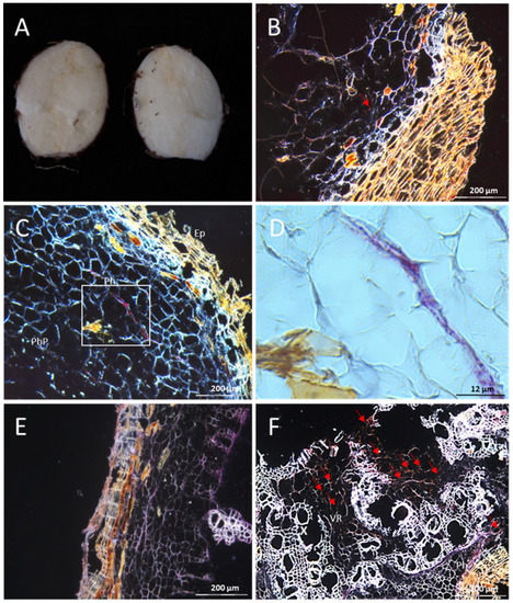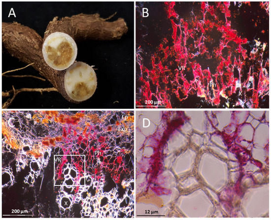 Satisfactory preparations of sections from tuberous roots, in particular from those with abundant necrotic tissue, were only achieved when root tissue was embedded in paraffin. Cryo-sections from those tissues readily tore apart because of the large areas composed of soft parenchyma cells and disintegrated necrotized tissue structures, impeding the obtainment of samples for further processing.