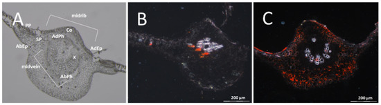 Distribution of CBSV-Mo83 RNA in cross sections of a cassava leaf from susceptible (Albert) and resistant lines. (A) Overview on the anatomy of a cassava leaf midrib. (B) Presence of the viral RNA mostly in the abaxial phloem cells in DSC 167 midvein. (C) Presence of viral RNA in phloem and non-phloem cells in Albert midvein. X, xylem; PP, palisade parenchyma; SP, spongy parenchyma; AdEp, adaxial epidermis; AbEp, abaxial epidermis; AbPh, abaxial phloem; AdPh, adaxial phloem; Co, collenchyma cells.