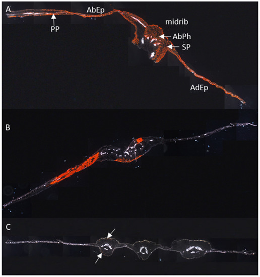 Distribution of CBSV-Mo83 RNA in cassava leaf sections. Panorama pictures were composed of cross sections from leaf tissues subjected to RNAscope® ISH using a CBSV-Mo83 probe. Red dot signals indicate the presence of viral RNA in phloem cells and non-phloem cells of the cassava variety (A) Albert, (B) Namikonga and (C) DSC 167, the latter showing signal only in few cortical collenchyma cells (white arrows). PP, palisade parenchyma; SP, spongy parenchyma; AdEp, adaxial epidermis; AbEp, abaxial epidermis; AbPh, abaxial phloem; AdPh, adaxial phloem.