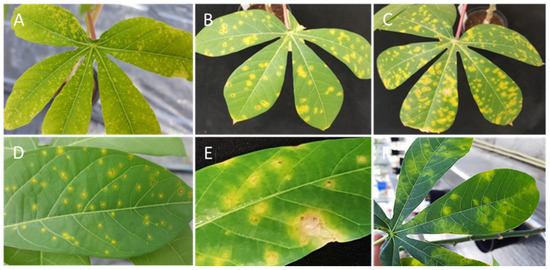 Differential response of cassava DSC 167 and TMS 96/0304 to infections with UCBSV-Ke125. The infection in DSC 167 starts with (A) yellow dots in the leaf that develop to (B,C) more significant yellow spots surrounded by necrotic spots. (D,E) Close-up of necrotic spots caused by UCBSV-Ke125. (F) Typical UCBSV-Ke125 symptoms on a susceptible TMS 96/0304.