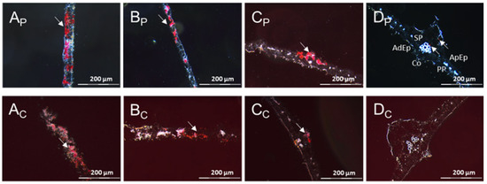 We studied this phenomenon by subjecting leaf, stem and root tissues to RNAscope® ISH using a probe against the UCBSV-Ke125 P1 gene. Prior to the assay, sections from the same tissue were prepared either by paraffin embedding or by cryo-sectioning to compare both methods. In DSC 167 leaves, UCBSV was mostly located in necrotic areas indicated by broadly distributed red signal clusters across all cell and tissue types in FFPE sections (Figure 12Ap,Bp) and cryo-sections (Figure 12Ac,Bc). In necrotic spot tissues, red signals were observed as small restricted clusters in both FFPE sections (Figure 12Cp) and cryo-sections (Figure 12Cc). Additionally, signals were observed in non-symptomatic leaf areas as small red dots, representing single viral RNA molecules; this pattern however was only observed in FFPE leaf sections (Figure 12Dp, white arrows) but not in RNAscope® ISH of respective cryo-sections (Figure 12Dc).
