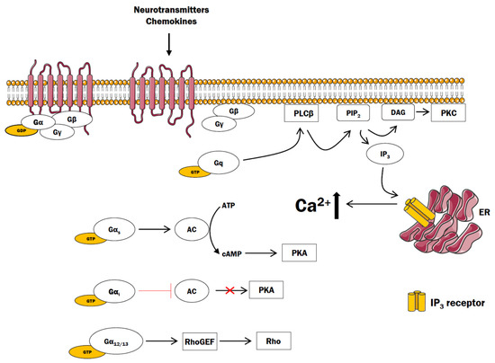 The G proteins are classified into four main families depending on the α subunit: Gi, Gs, Gq, and G12/13. In general terms, Gs and Gi families affect the intracellular cAMP concentration by regulating adenylyl cyclase activity, whereas Gq acts through phospholipase Cβ, and G12/13 activates downstream signaling of small GTPases [17] (Figure 1).