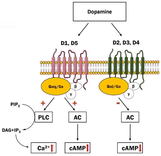 Stimulation of the D1-like receptors leads to the activation of the G protein Gαs, induction of adenylate cyclase (AC) activity, and subsequent activation of PKA (Figure 2). By contrast, the subfamily of D2-like receptors interact with the Gαi/o of G proteins leading to inhibition of AC activity and reduction of cyclic AMP production [41]. One of the key targets for PKA in the human brain appears to be dopamine- and cAMP-regulated phosphoprotein 32 kDa (DARPP-32), which modulates synaptic transmission, by regulating Na+, K+, and Ca2+ ion channels [42]. DARPP-32 has been found to affect the activity of the receptors for other neurotransmitters such as GABA or acetylcholine [43]. Interestingly, DARPP-32 level was relevantly decreased in the dorsolateral prefrontal cortex (DLPFC) in patients diagnosed with schizophrenia in comparison to controls subjects, which may indicate its involvement in disease-related dysfunction [44].