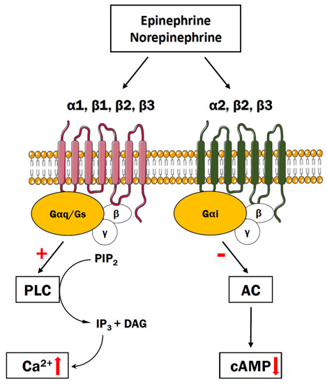 The epinephrine/norepinephrine system. The ligand (epinephrine or norepinephrine) binds adrenergic receptors that are coupled with either activation of PLC signaling resulting in release of Ca2+ from the ER or inhibition of adenylyl cyclase, thus decreasing cAMP concentration.