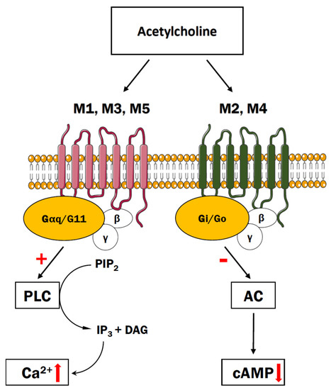Muscarinic acetylcholine receptors (mAChRs) are metabotropic receptors that become activated upon binding of neurotransmitter acetylcholine (ACh). Upon activation of the neuron, ACh is released from the synaptic vesicles into the synaptic cleft where it binds to presynaptic and postsynaptic receptors or is inactivated by the enzyme cholinesterase [104]. There are five subtypes of muscarinic receptors, designated as M1–M5, that can be further subdivided into two groups depending on their functional properties [105]. Stimulation of M1, M3, and M5 receptors, that are expressed postsynaptically across many brain regions and coupled to Gi/o G-type proteins, initiates the cascade of PLC-dependent reactions related to formation of DAG and IP3 (Figure 4). The M1 receptor is a predominant subtype detected mainly in cortical and hippocampal neurons whereas neuronal M3 and M5 subtypes are present at low levels and their role is relatively little known. By contrast, M2 and M4 muscarinic receptors interact with Gi and Go-type G proteins and negatively influence adenylyl cyclase, thus inhibiting formation of cAMP [106,107]. In the cerebral cortex and hippocampus, M2 receptors have been reported to localize at both cholinergic and non-cholinergic presynaptic terminals [108,109]. The M4 receptors are found at the presynaptic terminals of cholinergic interneurons within the striatum [110] and they also seem to be present in the medium spiny neurons of the direct pathway [111]. In contrast to the nicotinic cholinergic receptors, mAChRs act slower but exert potentially more sustained synaptic response acting through second messengers.