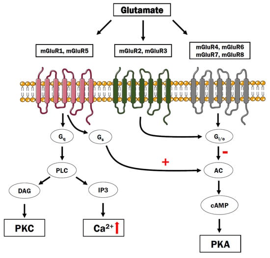 Metabotropic glutamate receptors are encoded by GRM1 to GRM8 genes and have a modulatory function for the release of neurotransmitters, regulation of neuroplasticity, and synaptic excitability [174]. Based on receptor structure, ligand selectivity, and the psychological effect caused by activation of the receptor, mGluRs are classified into three groups: Group I, Group II, and Group III (Figure 5). Activation of Group I (mGluR1 and mGluR5) receptors causes phospholipase C-mediated effect, while Group II (mGluR2 and mGluR3) and Group III (mGluR4,6,7,8) receptors are associated with inhibition of cAMP signaling through Gi/Go protein [175]. All of the mGluR are present in neuron and glial cells, the only exception is mGluR6 which is primarily located in the retina [176].
