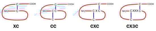 Chemotactic cytokines (chemokines) are small alkaline peptides (7 to 15 kDa) known as the important mediators of inflammatory processes. Based on the number of amino acids between the two cysteines at the amine end of the molecule, they are classified into four groups: XC, CC, CXC, and CX3C, where C is cysteine and X represents another amino acid [242]. Chemokines usually possess the conserved four cysteines and formation of disulfide bridges determines their three-dimensional structure (Figure 6). So far, about 50 chemokines and 10 receptors for CC subtype, 7 for CXC subtype, and single receptors for XC and CX3C chemokines have been identified [243]. Although most chemokine receptors belong to the classic G protein receptors, there is also a group of so-called atypical chemokine receptors (ACKRs), with at least 6 representatives [244]. They bind chemokines with high affinity, but due to their structural inability to couple to G proteins, they do not induce cell migration and act mainly as “capturers” of chemokine, reducing inflammation or shaping chemokine gradients [245]. Signals from chemokine receptors are transmitted by two major routes: G proteins and β-arrestin; however, these processes are cell- and tissue-dependent, and can be modulated by the ligands or receptors involved [246,247].