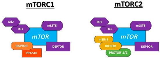 The mechanistic or mammalian target of rapamycin (mTOR) is an evolutionary conserved serine/threonine protein kinase which is related to the PI3K kinase family (PIKK) [143] and exists in two different complexes: mTORC1 and mTORC2 [144,145], known as “rapamycin-sensitive” and “rapamycin-insensitive”, respectively [144].