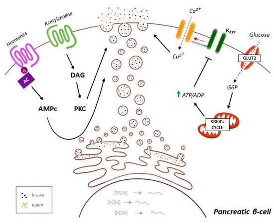 Mechanisms involved in insulin and hIAPP cosecretion in pancreatic β-cell. The most important physiological stimulus of insulin secretion is glucose. Glucose is transported inside the cell thanks to GLUT2, entering the Krebs Cycle and glycolysis. These processes produced a higher ATP/ADP rate that inhibits ATP-dependent K+ channels, depolarizing the membrane. Changes in the potential of membrane open Ca2+ channels, introducing Ca2+ into the cell and promoting the release of the insulin into blood flow after glucose intake. Not only this pathway releases this hormone, but also an increment of AMPc via apetite’s hormones signaling and the activation of PKC, due to the adrenergic response. What is more important is that amylin or hIAPP is cosecreted in these insulin granules after its maturation in ER.