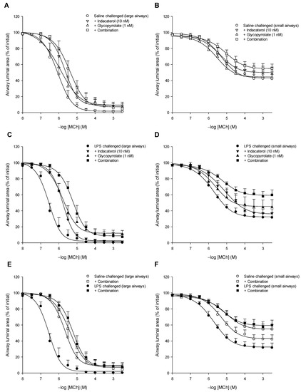 3.4. Effect of (the Combination of) Low Concentrations of Indacaterol and Glycopyrrolate on Methacholine-Induced Airway Constrictions in a Guinea Pig Model of COPD