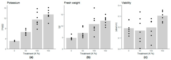 Effect of potassium treatments (0%, 50%, 100%, and 150%) on (a) intracellular potassium content per dry weight, (b) fresh weight and (c) viability of cells. The low potassium contents in the culture medium decreased the potassium content of the cells, which inhibited the growth linearly. Cell viability was higher in the 150% K treatment compared to the other treatments.