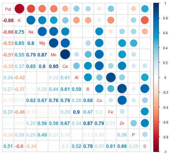 Correlation plot of the contents of free Put and chemical elements in Scots pine embryogenic cells under potassium treatments. Put correlated negatively with potassium (K, R2 = −0.88) sodium (Na, R2 = −0.66) magnesium (Mg, R2 = −0.53) and manganese (Mn, R2 = −0.51) and positively with sulfur (S, R2 = 0.51). Put did not show a correlation between phosphorus (P), calcium (Ca), copper (Cu), zinc (Zn), boron (B), aluminum (Al), and iron (Fe) (0.37 > R2 > −0.35).