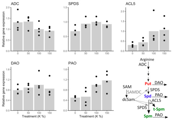 Expression of key enzyme genes in PA metabolic pathway under potassium (K) treatments. ADC expression showed an increasing trend, whereas the expression of SPDS, ACL5, and PAO decreased, and the expression of DAO was not affected by potassium deficiency.