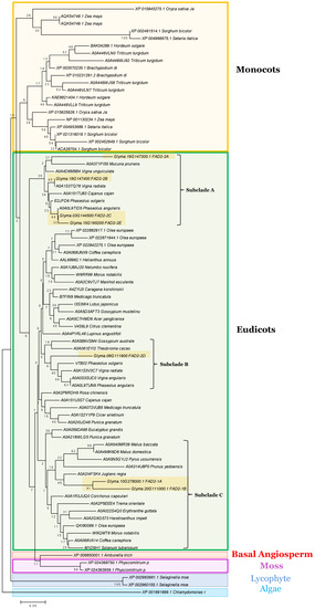 GmFAD2 sequences used in the phylogenetic analyses were retrieved from different databases including UniProt, NCBI, Soybase (W82.a2.v1), and Phytozome (v12.1). Sequences were identified by querying sequences from the seven members belonging to the two GmFAD2 subfamilies against sequences from these databases using tblastn default parameters. Sequences from monocots, eudictos, and basal angiosperm with 90% identity/similarity and above were selected, in addition to other GmFAD2 homologs from plant primitive species including, algae, moss, and a lycophyte. The retrieved GmFAD2 sequences belong to sets of plants (48 in total) with fully sequenced genomes representing key positions in the angiosperm phylogenetic tree. Sequences were carefully inspected and corrected for annotation errors before use. Multiple sequence alignments of the retrieved GmFAD2s were performed using the MEGA4 software package [31] and the ClustalW sequence alignment tools. An unrooted phylogenetic tree was calculated with the neighbor-joining method [32]. Next, tree topology robustness was tested through bootstrap analysis of 1000 replicates.