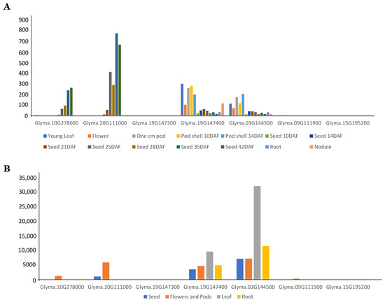 Four plant soybean tissues were used for RNA-seq including seed, leaf, root, flower and pods. Total RNA of each sample was extracted from 100 mg of frozen grounded samples using RNeasy QIAGEN KIT (Cat. No./ID: 74004). Total RNA was treated with DNase I (Invitrogen, Carlsbad, CA, USA). RNA-seq libraries preparation and sequencing were performed at Novogene INC. using Illumina NovaSeq 6000. The four libraries were multiplexed and sequenced in two different lanes generating 20 million raw pair end reads per sample (150bp). Quality assessment of sequenced reads was performed using fastqc, version 0.11.9 [34]. After removing the low-quality reads and adapters with trimmomatic, version V0.39 [34], the remaining high-quality reads were mapped to the soybean reference genome Wm82.a2.v1 using STAR, version v2.7.9 [52,53]. Uniquely mapped reads were counted using Python package HTseq v0.13.5 [54]. Read count normalization and differential gene expression analysis were conducted using the Deseq2 package v1.30.1 [55] integrated in the OmicsBox platform from BioBam (Valencia, Spain).