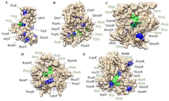Figure 3. Homology modeling of the five GmFAD2-2 proteins and corresponding identified EMS mutations. Mutated residues on the five GmFAD2-2 proteins identified by Tilling-by-Sequencing+ were mapped on the five GmFAD2-2 protein homology models. Homology modeling of the GmFAD2-2A (A), GmFAD2-2B (B), GmFAD2-2C (C), GmFAD2-2D (D), and GmFAD2-2E (E) predicted proteins. The identified mutations and corresponding amino acid changes are shown on blue. Putative di-iron binding sites residues and substrate-binding pocket are shown in green.