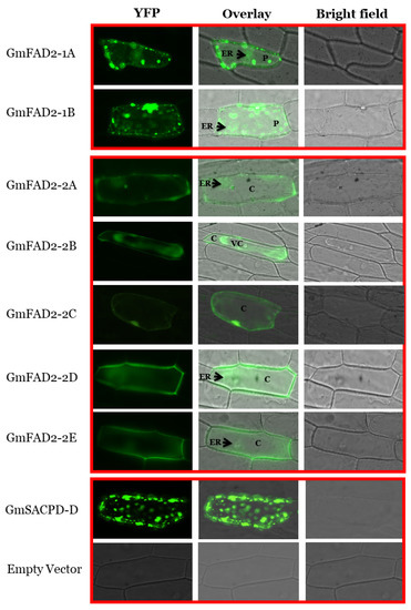 Figure 4. Subcellular localization of soybean GmFAD2-1 and GmFAD2-2 proteins. The GmFAD2 coding sequences from all seven members were fused to eYFP and delivered into onion epidermal cells using biolistic bombardment. GmFAD2-1A and GmFAD2-1B showed an endoplasmic reticulum (ER) and chloroplastic (P) localization pattern. GmFAD2-2A, GmFAD2-2D, and GmFAD2-2E showed a reticulum endoplasmic and cytosol (C) localization. GmFAD2-2C signal was found in the cytosol only. GmFAD2-2B shows a vacuole (VC) and cytoplasmic localization. The chloroplast-targeted GmSACPD-D was used as positive control [29]. Bar = 100 µM.