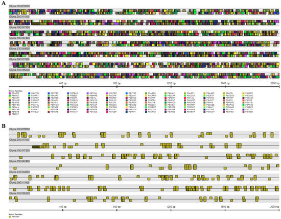 Figure 5. Analysis of putative cis-elements in the promoter region of the GmFAD2-1 and GmFAD2-2 gene members. (A) All identified cis-elements at the GmFAD2-1 and GmFAD2-2 promoter region (−2 Kb upstream). (B) Shows the conserved Arabidopsis homeobox protein domain (P$AHBP) that was shared between all GmFAD2-1 and GmFAD2-2 subfamily members with a total match that was significantly higher (459) when compared to the other cis-elements shown in (A).