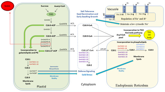 Figure 6. Cartoon deciphering the soybean seed fatty acid biosynthesis pathway. The seven GmFAD2-1 and GmFAD2-2 members are responsible for converting oleic acid (C18:0-ACP) to linoleic acid (C18:1Δ9-ACP) in the plastid (GmFAD2-1A and GmFAD2-1B), ER (GmFAD2-1A, GmFAD2-1B, GmFAD2-2A, GmFAD2-2D, and GmFAD2-2E), and cytoplasm (GmFAD2-2A, GmFAD2-2B, GmFAD2-2C, GmFAD2-2D, and GmFAD2-2E). GmFAD2-2B is located in the vacuole and is likely to play a role during seed germination and early seed growth by maintaining low cytosolic Na+ as described in Arabidopsis [65]. In bold are the five newly identified fatty acid desaturases involved in the unsaturated fatty acid biosynthesis. GmFAD2-2A, GmFAD2-2B, GmFAD2-2C, GmFAD2-2D, and GmFAD2-2E members present a good alternative for converting oleic acid content without substantially altering the traditional plastidial/ER fatty acid production pathway in soybean. The flux of fatty acids between the plastid and the ER occurs among different plant species [66]. A portion of C16:0-ACP, C18:0-ACP, and C18:1-ACP pool can be incorporated into phosphatidylglycerol (PG) and galactolipids in the plastid. A portion of the acyl-CoA moieties can be incorporated into triacylglycerol (TAG, the major lipid fraction in plant seed oils) biosynthesis in the seed via the Kennedy pathway. GmFAD3 genes are differentially expressed during seed development or cold temperature exposure [67]. The GmFAD7/8 promote C18:3 biosynthesis in the plastid, acting as precursors for the biosynthesis of Jasmonate and are expected to be involved in defense responses and biotic stress signaling [67]. GmSACPD-C is the nodule specific isoforms as shown earlier [29].