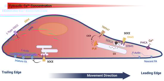 Model summarizing the polarization of various cytoskeletal and Ca2+ signaling components in a migrating cell. Mature focal adhesions (FA), L-type voltage-gated Ca2+ channels (VGCC), ERM (Ezrin, Radixin and Moesin) proteins, as well as cortical actin (Membrane Proximal Actin (MPA) are enriched at the rear end of the cell. TRPM7 and the plasma membrane Ca2+-ATPase (PMCA) are enriched at the leading edge of the migrating cell. Store-operated Ca2+ entry (SOCE), which is mediated by STIM1 and Orai1 have been functionally implicated in disassembly of FA at the rear end, as well as in refilling Ca2+ stores at the leading edge. See text for further details. The figure was created using BioRender.com.