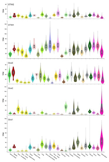 Expression levels of STIM and Orai isoforms in human organs. Data were obtained from the Genotype-Tissue Expression (GTEx) portal and are expressed as transcripts per million (TPM).
